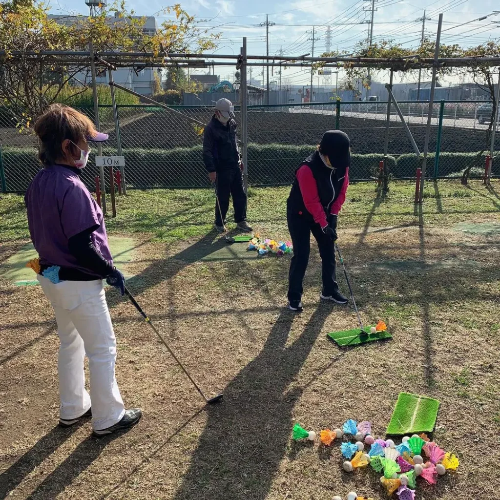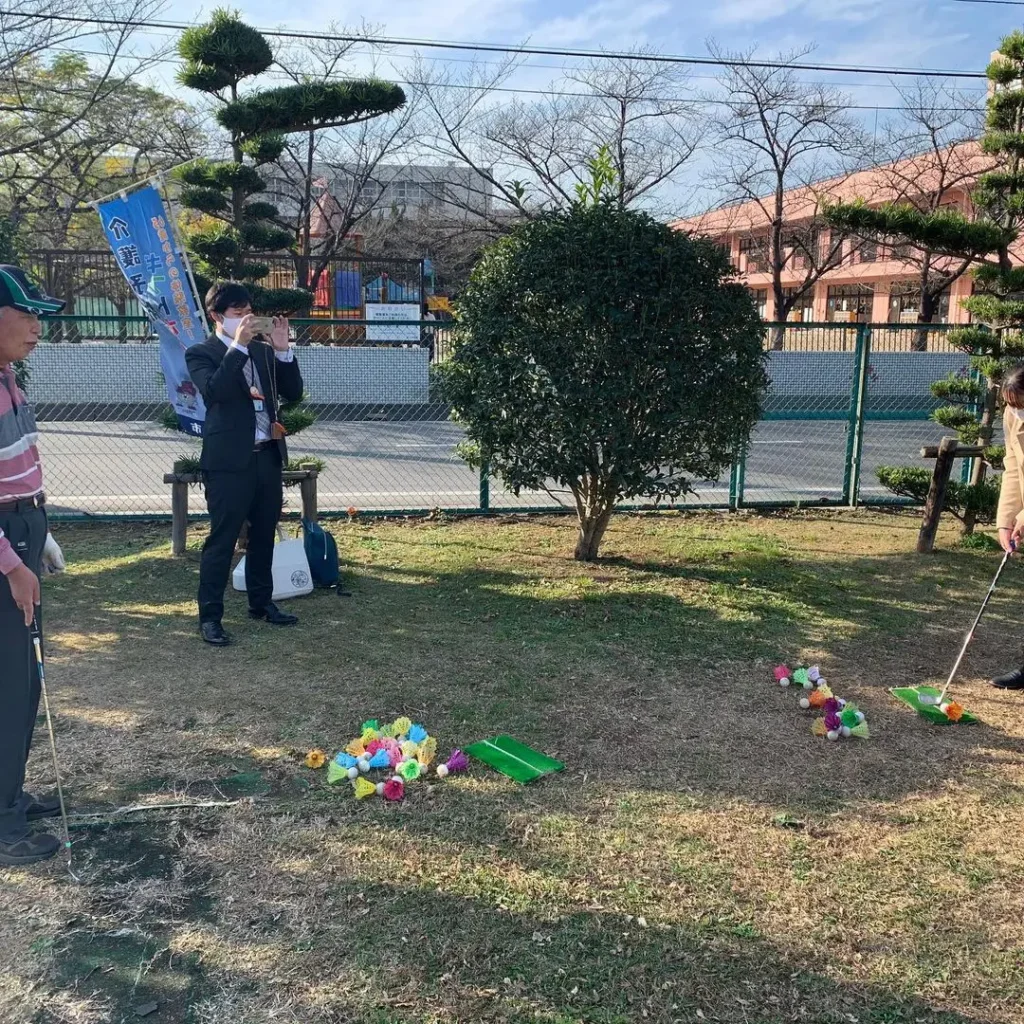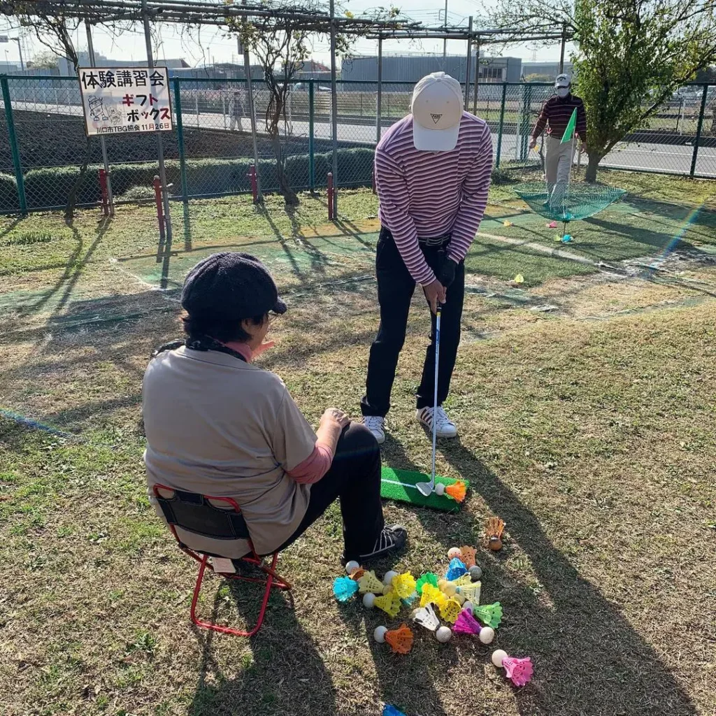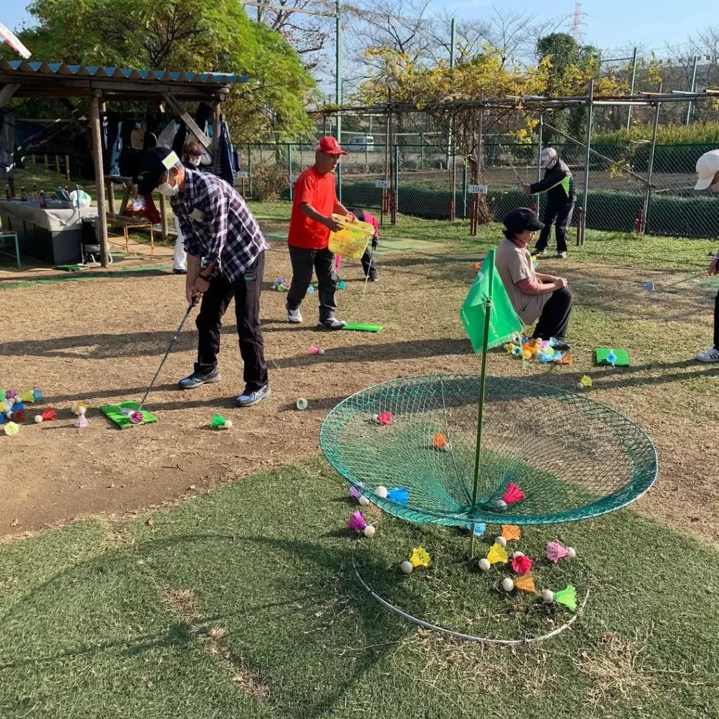 北スポーツセンター(埼玉県川口市)のターゲットバードゴルフ場で、『介護予防ギフトボックス』の体験講習会が開催時の様子です。